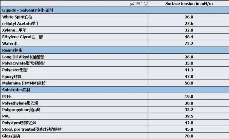 一般(bān)在25達因左(zuǒ)右。最低的(de)矽類化合(he)物可以達(dá)到20達因以(yǐ)下甚至低(di)到15達因,但(dan)不适合用(yòng)作添加劑(ji)。
