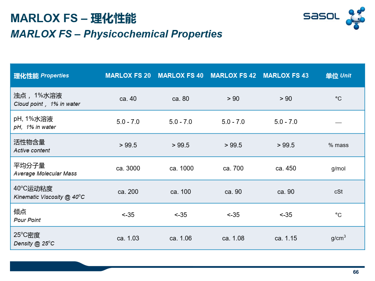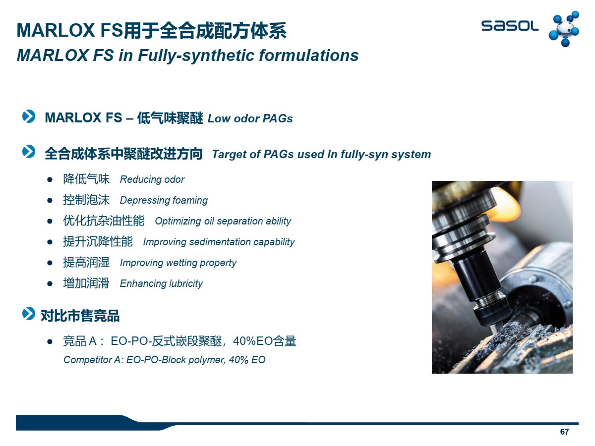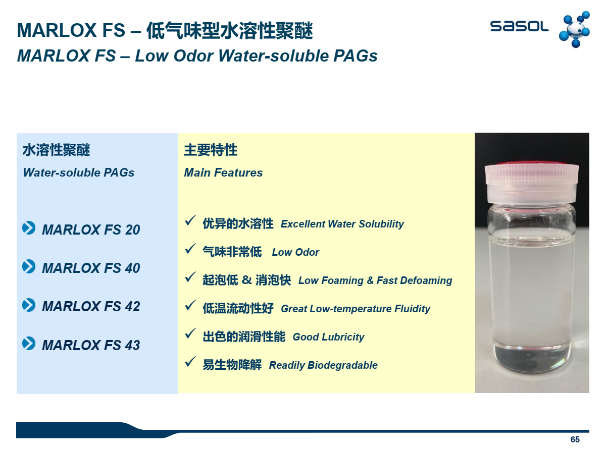 Marlox FS低氣味型水(shuǐ)溶性聚醚(Marlox FS-Low Odor Water-soluble PAGs),包(bao)括MARLOX FS 20,MARLOX FS 40,MARLOX FS 42,MARLOX FS 43等産品,具(ju)有優異的水(shuǐ)🌈溶性,極低的(de)氣味,低起泡(pao)性和快速消(xiao)泡,低溫流動(dong)性好,出色的(de)潤滑性能和(he)易生物降解(jiě)等特點。用于(yu)高端半合成(chéng)、全合成金屬(shǔ)加工液及半(ban)合成、全合成(cheng)潤滑油産品(pin)。