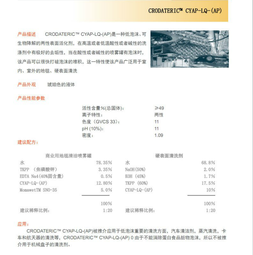 CRODATERIC CYAP-LQ-AP是一種(zhǒng)低泡沫、可(ke)生物降解(jiě)的兩性表(biao)面活性劑(ji),在高溫👨❤️👨或(huò)者低溫酸(suān)性或者堿(jian)性的洗滌(dí)劑中有極(ji)好的去🥵垢(gòu)性,當在酸(suān)性或者堿(jian)性的噴霧(wù)罐有泡沫(mò)時,該産品(pǐn)可以很快(kuài)打破泡沫(mo)的堆積,這(zhè)👣一特性使(shǐ)該産品廣(guǎng)泛用于室(shi)内、室外的(de)地毯、硬表(biao)面清洗領(ling)域。