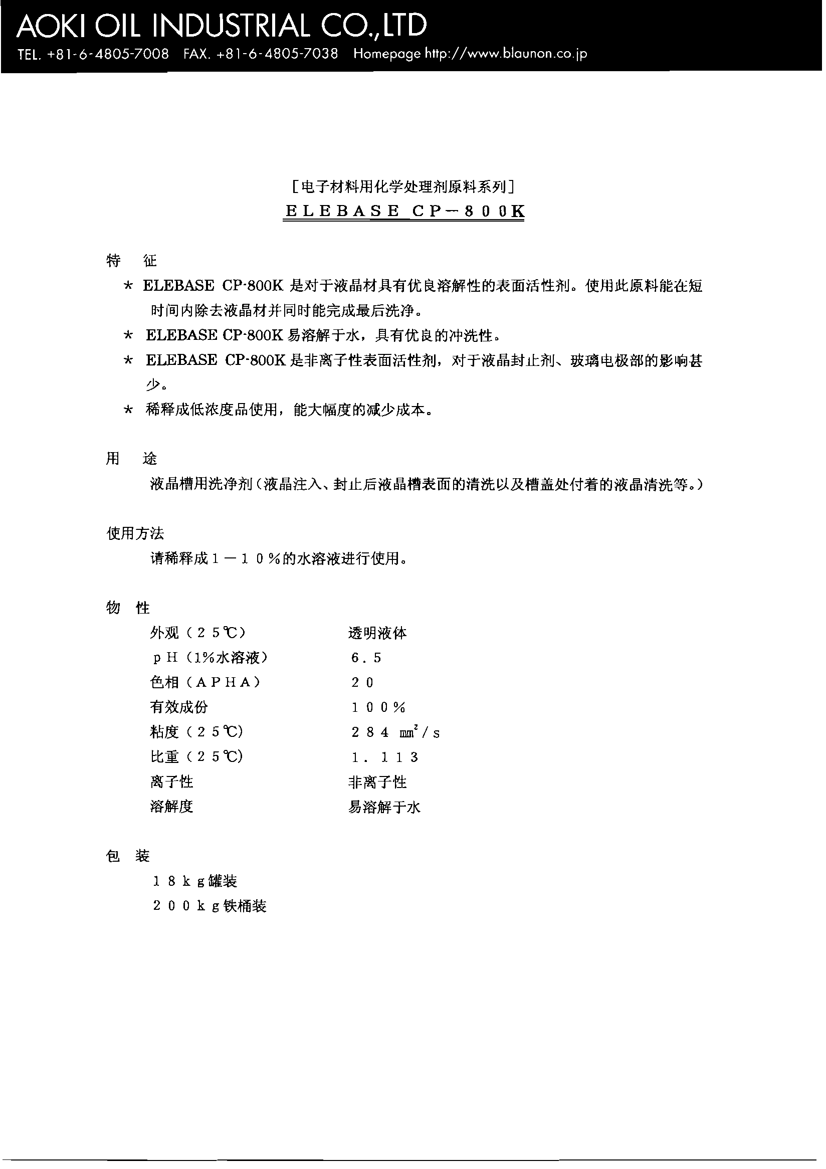 青木油脂制造液(ye)晶顯示屏濾色膜(mo)用顯影液DEVELOPER AOK-125