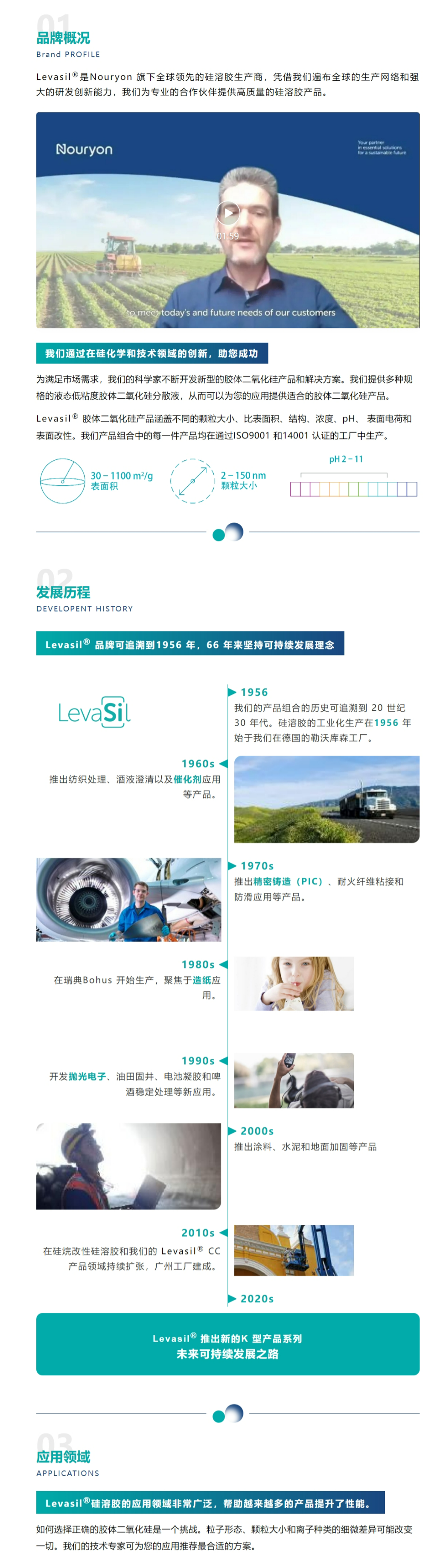Levasil®是Nouryon(諾力(li)昂) 旗下(xià)全球領(lǐng)先的矽(xi)溶膠生(sheng)産商,憑(píng)借我們(men)遍布全(quán)球的生(sheng)産網絡(luò)和強大(dà)的研發(fā)創新能(neng)力,我們(men)爲專業(ye)的合作(zuò)夥伴提(tí)供高質(zhì)量的矽(xi)溶膠産(chǎn)品。Levasil® 矽溶(róng)膠的工(gong)業化始(shǐ)于1956年我(wǒ)們在德(de)國的勒(lè)沃庫森(sen)工廠。66年(nian)來,我們(men)的産品(pǐn)已廣泛(fàn)應用于(yu)造紙,塗(tu)料,建築(zhù),電子,催(cuī)化劑,鑄(zhu)造,油田(tian)服務,水(shuǐ)處理等(deng)領域,爲(wèi)越來越(yue)多的産(chan)品提升(sheng)性能,幫(bang)助世界(jie)各地的(de)客戶獲(huò)得成功(gōng)。